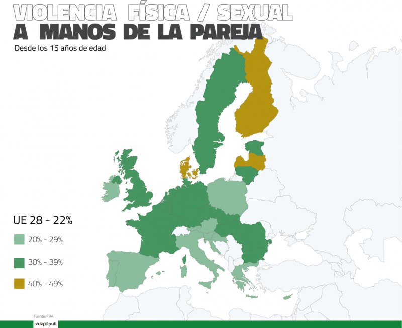 Según el último estudio disponible de la FRA-Agencia de los Derechos Fundamentales de la Unión Europea, de 2014, que pregunta a las mujeres si han sufrido violencia física o sexual, los países miembros que encabezan la lista por número de casos son Dinamarca (52%), Finlandia (47%), Suecia (46%) y Francia y Reino Unido, con un 44%. Porcentualmente, España tiene uno de los más bajos: el 22%.