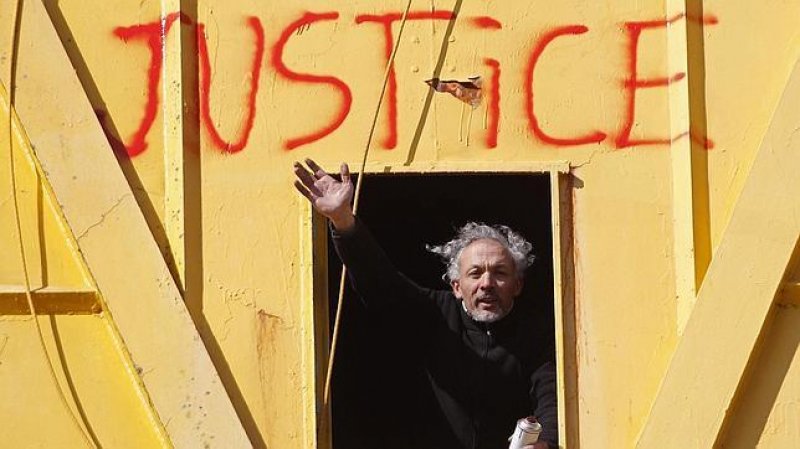 Serge Charnay saluda desde lo alto de la grúa donde se encaramó para pedir volver a ver a su hijo